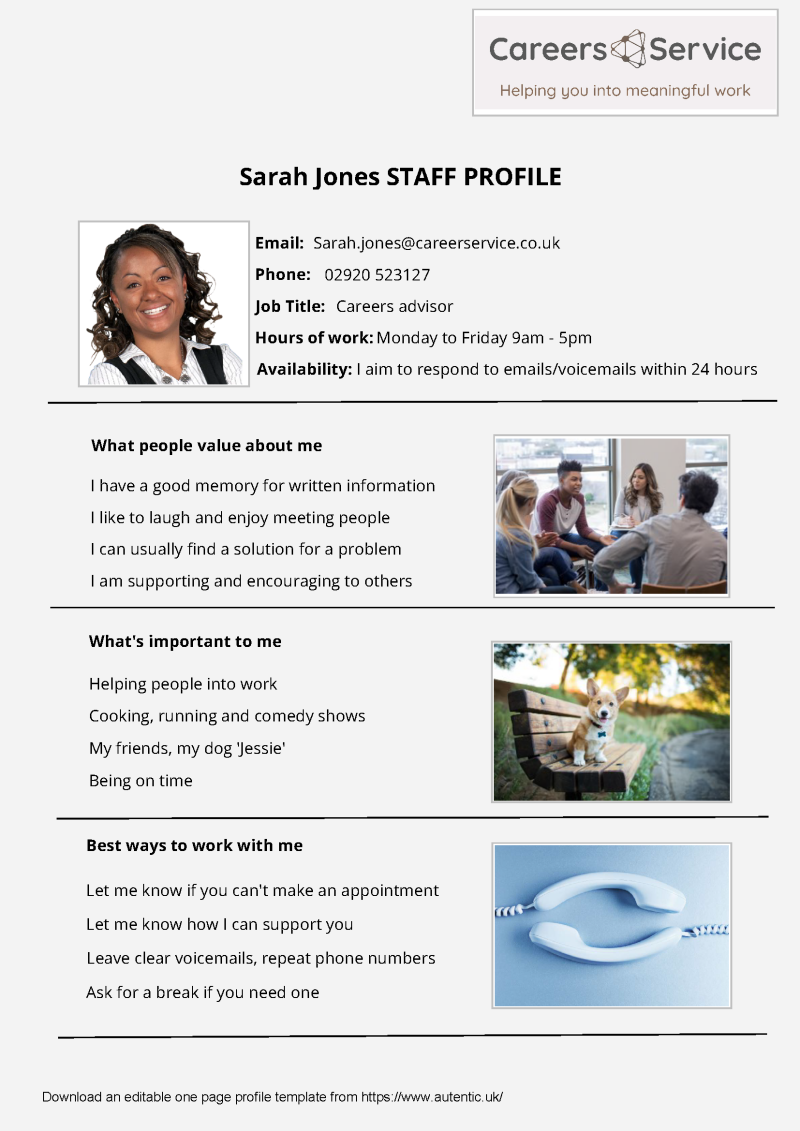 Autistic people often feel overwhelmed meeting new people, if there is no context and visual supporting information. Use our simple editable profile to develop your own one page profile, to provide familiarity for new people meeting you.